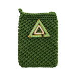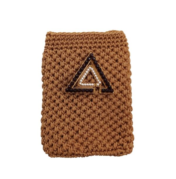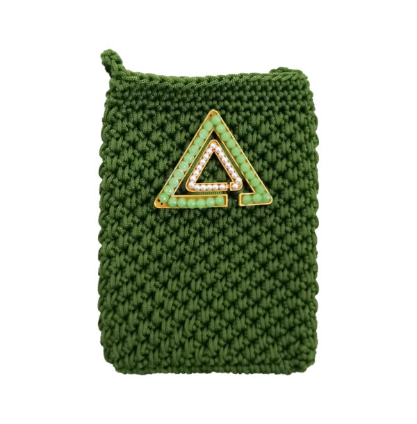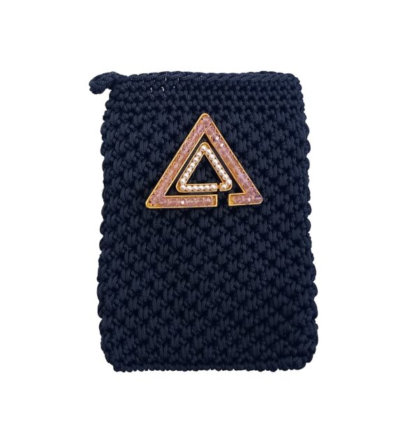 Elegante pochette con tracolla realizzata interamente a mano con la tecnica dell’uncinetto. Un accessorio artigianale impreziosito con il dettaglio dell’ inconfondibile delta interamente fatto con perline incastonate.